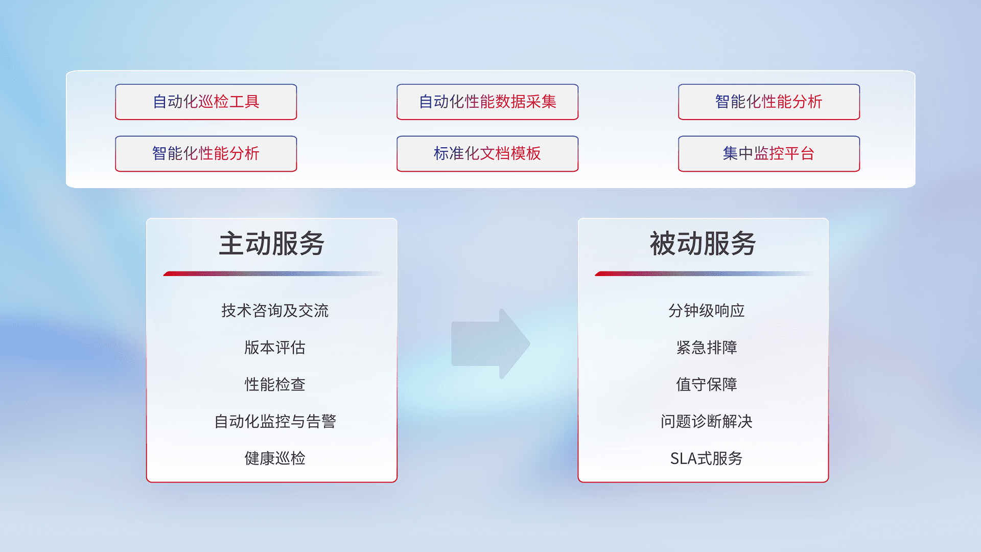 智能化工具和标准化文档,,保障服务质量,,,提供主动服务(包含技术咨询、、版本评估、、性能检查、、自动化监控与告警、、、健康巡检)和被动服务包含(分钟级响应、、、、紧急排障、、、、值守保障、、、问题诊断解决、、、、SLA服务)。。。。