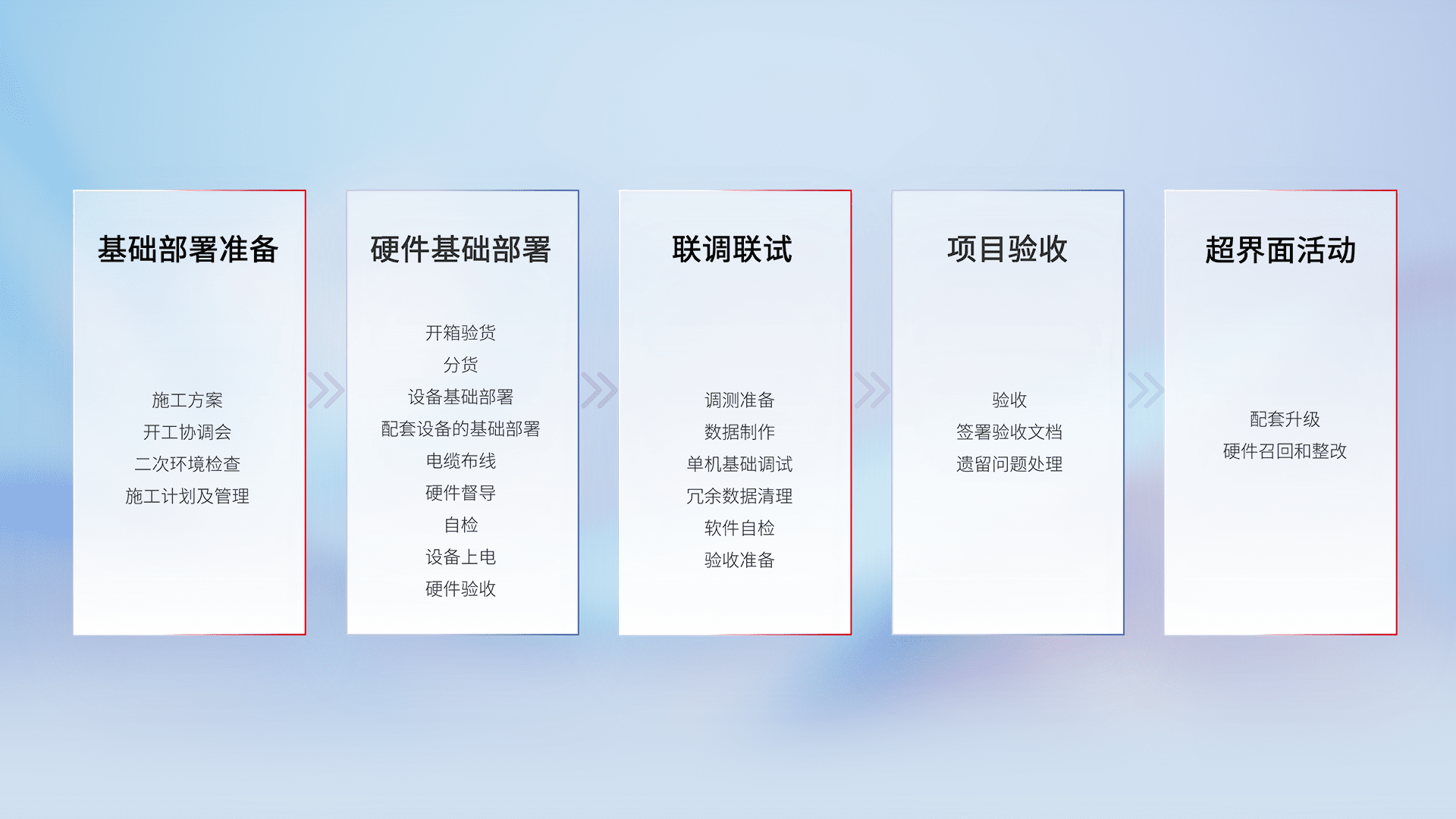 从基础部署准备、、硬件基础部署、、、、联调联试、、项目验收、、越界面活动的全过程可追溯,,,,保证施工质量和进度。。。